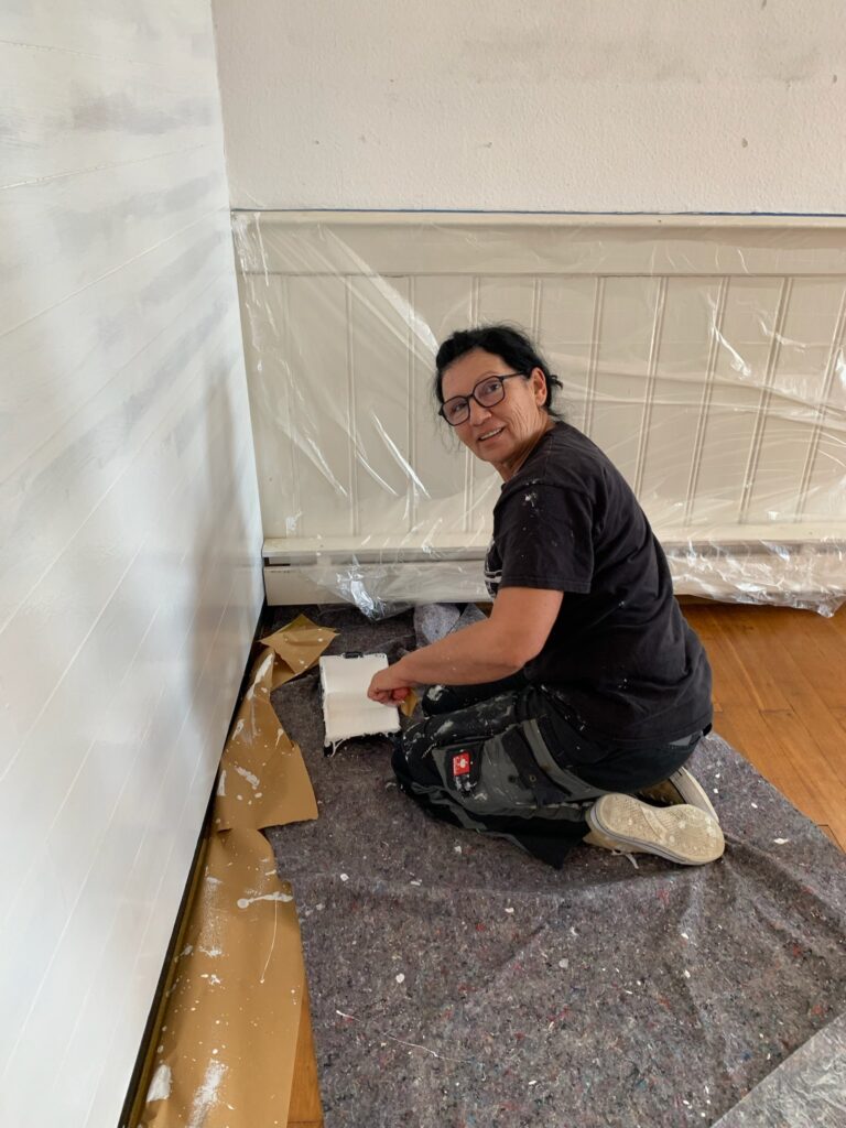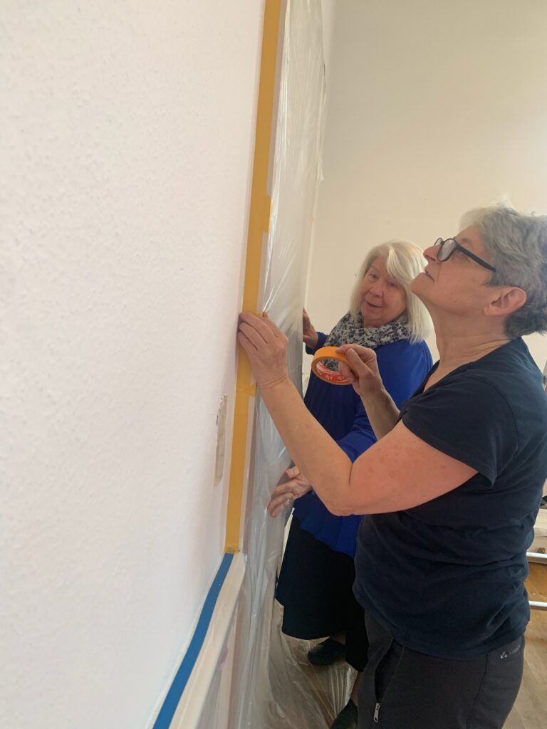 da wir jetzt schon voll im Renovieren und Streichen waren, haben wir gemeinsam beschlossen, den Saal auch gleich noch weiß zu streichen. Da in unseren Köpfen schon lange die Idee des Anstreichens der braunen Holzwand herumschwirrte. Es war leider nicht ganzso einfach, wie wir uns das vorgestellt hatten; aber in zwei Tagen mit fünf begabten Malern und 2 Eimern / 10 Litern Farbe gelang uns dann doch einen schönen hellen Saal zu bewerkstelligen. Und dieser ist seit Freitag (05.04.24) auch wieder zu benutzen. Gleichzeitig wurde der Gang im Erdgeschoss auch neu gestrichen, der es nötig hatte. Dort muss jetzt nur der Stuck evtl. mit einer anderen dezenten Farbe abgesetzt werden.